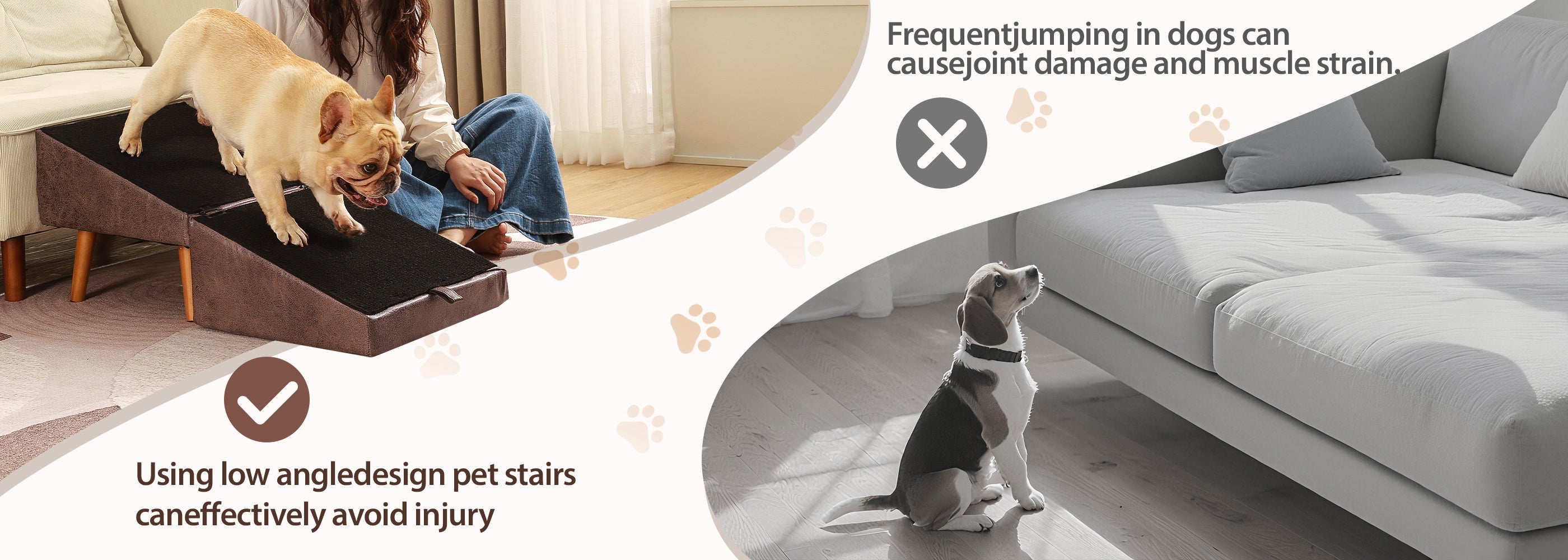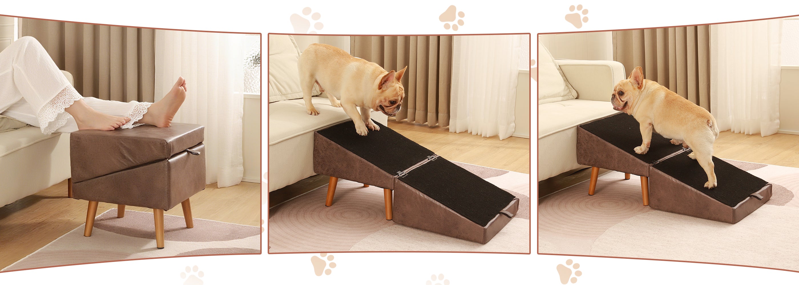 The 2-in-1 Dog Ramp + Ottoman provides a gentle 23.8° slope for senior, injured, or small dogs. Folds into a stylish ottoman, saving space while keeping pets comfortable.