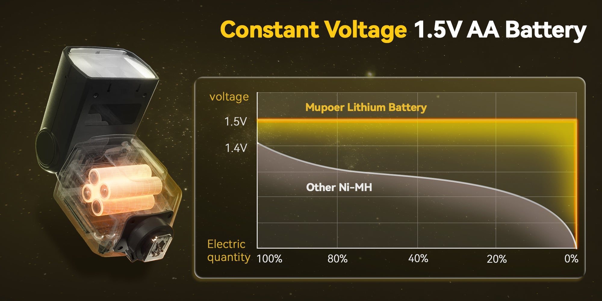 Mupoer’s 1.5V constant voltage ensures continuous, reliable power, providing better performance compared to conventional batteries that fade as they discharge.